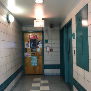 Getting closer to the school I witnessed perhaps one of the most 'New York' scenes ever: children running around the street with their friends as two fire hydrants spurted water out across to the other sidewalk. The kids were laughing and chasing each other, supervised by teachers who were cheering them on. This must be some kind of school sports activity. I wondered straight away if this was because the school was co-located and they had limited playground space. But it was not, apparently the school occupies the entire building. The hallways looked like your typical American school, but significantly better thought out in terms of decoration and colour. It seemed the teachers had made some effort to add variety (such as creative seating) in the hallway.